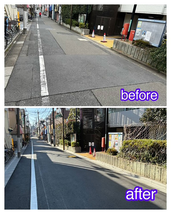 道路課に掛け合い少し時間は掛かりましたが、綺麗に舗装の改修工事をして頂けました。これで道行く人も安心です!